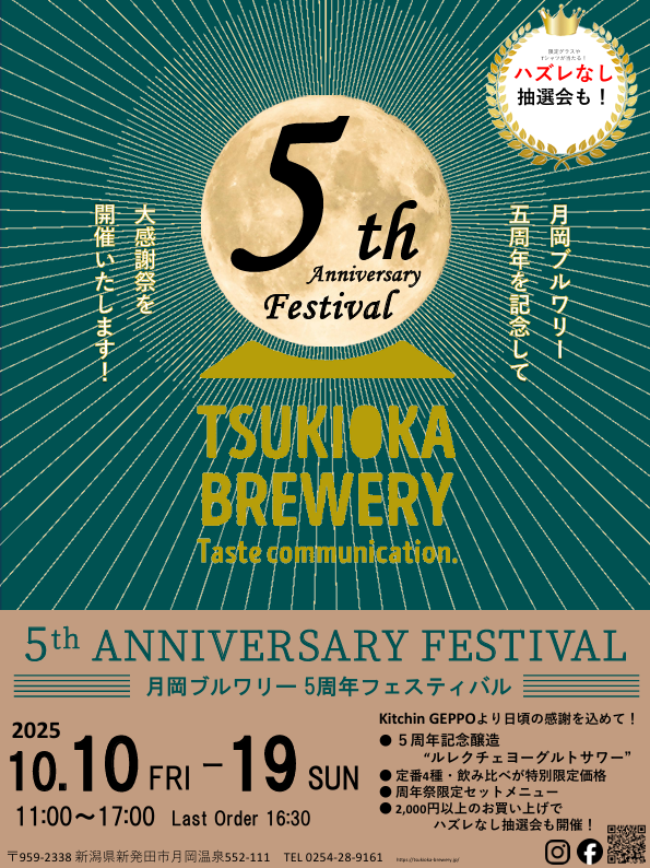 ◆イベント概要◆ 【開催期間】 2025年10月10日(金)~19日(日) 【開催場所】 TSUKIOKA BREWERY & KITCHEN GEPPO 新潟県新発田市月岡温泉552-111 【5周年記念醸造ビール登場!】 「ルレクチェヨーグルトサワー」が記念醸造に!!5周年祭記念ビールをお楽しみください 【定番4種・飲み比べが特別価格に!】 定番商品も、この期間だけの特別価格でご提供! 定番4種¥680(税込)⇒¥500(税込) 4種飲み比べ¥1380(税込)⇒¥1000(税込) 【お得な周年祭限定セットメニュー】 5周年祭限定フード+クラフトビールのセットメニューがお得に!食べて・飲んで・笑って、思い出に残るひとときを。 【2,000円以上のお買い上げで“ハズレなし抽選会”に参加!】 豪華景品がその場で当たるチャンス! 月岡温泉にお越しの際は、ぜひブルワリーへ。 皆さまのご来店を、スタッフ一同心よりお待ちしております! |