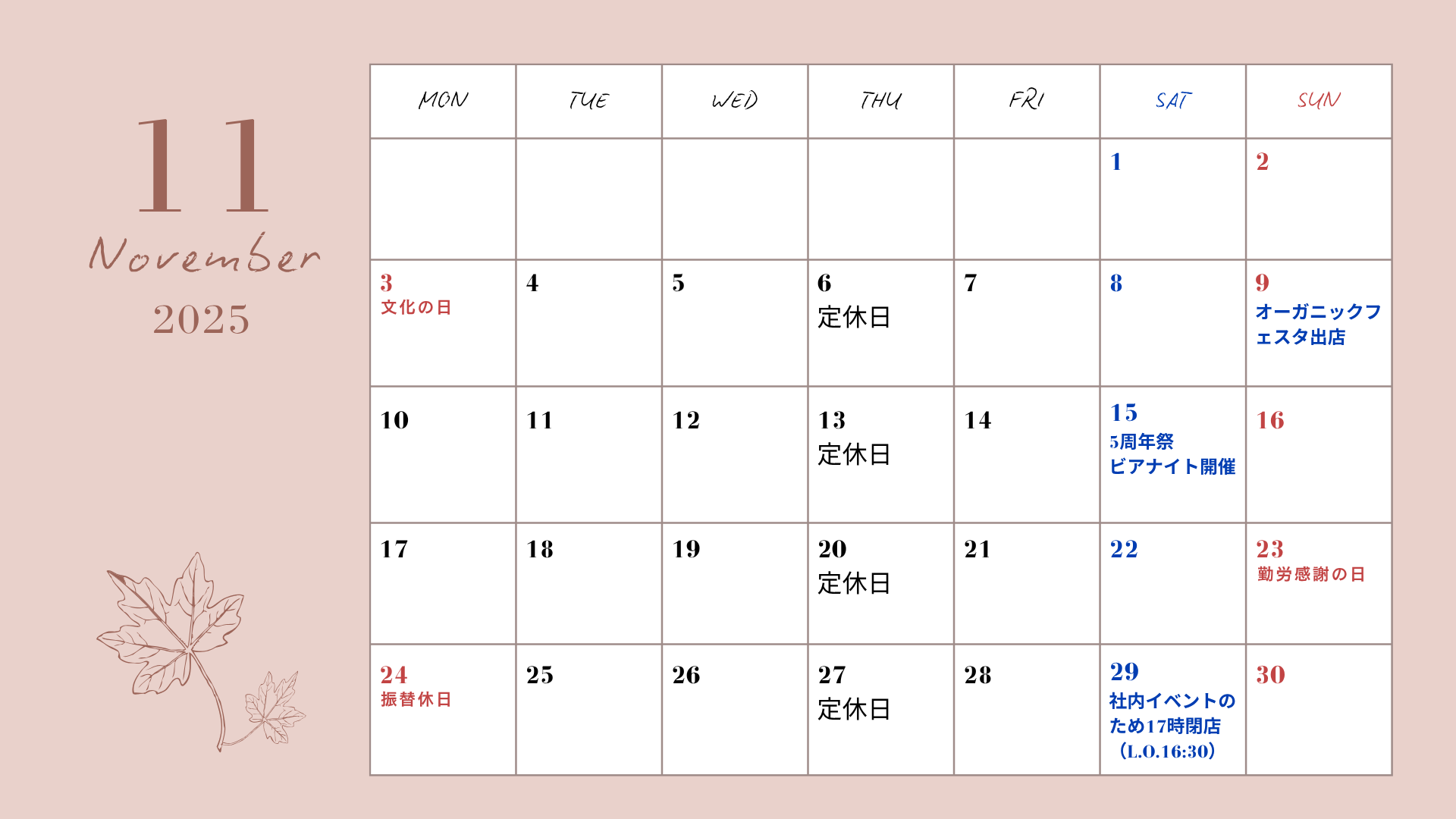 | いつも月岡ブルワリーをご利用いただきありがとうございます。 朝晩の空気がぐっと冷たくなり、ホットビールやまったりクラフトタイムが恋しい季節になりました 11月の営業日カレンダーをお知らせいたします。 お出かけの際はぜひチェックしてからお越しください。 【イベント情報】 ~にいがたオーガニックフェスタ2025 ~ 日時:11月9日(土) 10:00〜15:00 会場:ヨリネスしばた 札の辻広場 Instagram⇒こちら 来て、見て、食べて、繋がる地域の輪 美味しいもの、素敵な作品が揃っております! たくさんのご来場をお待ちしております ~月岡ブルワリー5周年祭 開催!~ 日時:11月15日(土)18:00~23:00【L.O.22:00】 会場:アマリロ & OLMO(2会場出入り自由!) 内容:ビール飲み放題+各店舗ワンプレートおつまみ付き 【アマリロ】 新潟県新潟市中央区天神1丁目19-7 Tel:025-290-7070 【OLMO】 新潟県新潟市中央区米山1丁目9-5 Tel:090-5960-0848 チケット 前売:5,500円(税込・記念グラスなし)/6,000円(税込・記念グラス付き) ※前売りチケットが断然お得 当日:6,000円(税込) 記念グラス単品:1,000円(税込) ※チケットはアマリロ、OLMO、月岡ブルワリーにて販売中です。 5年間の感謝を込めた、ここでしか味わえない夜。仲間やご家族と一緒に、ぜひご参加ください! みなさまのご来店を心よりお待ちしております。 温泉街のあたたかい灯りとクラフトビールで、ほっとひと息どうぞ |
