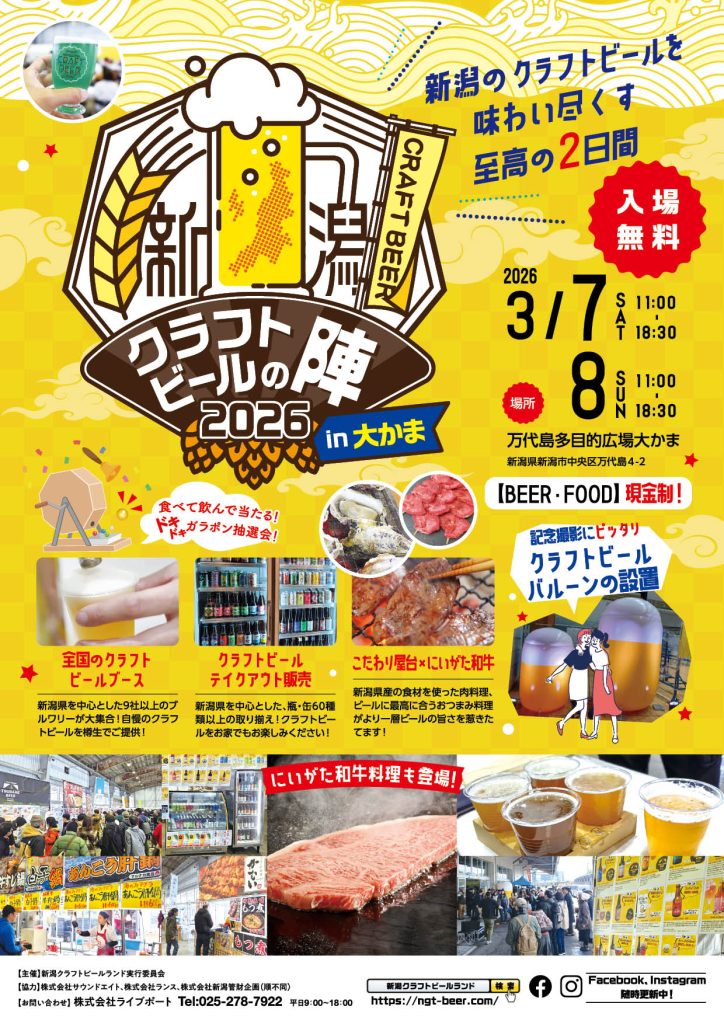 ━━━━━━━━━━━━━━ ■クラフトビールの陣2026 in大かま 出陣 ━━━━━━━━━━━━━━ 【開催日時】 【 3月7日(土) 11:00~18:30 】 【 3月8日(日) 11:00~18:30 】 【開催場所】 万代島多目的広場大かま新潟県新潟市中央区万代島4-2 |