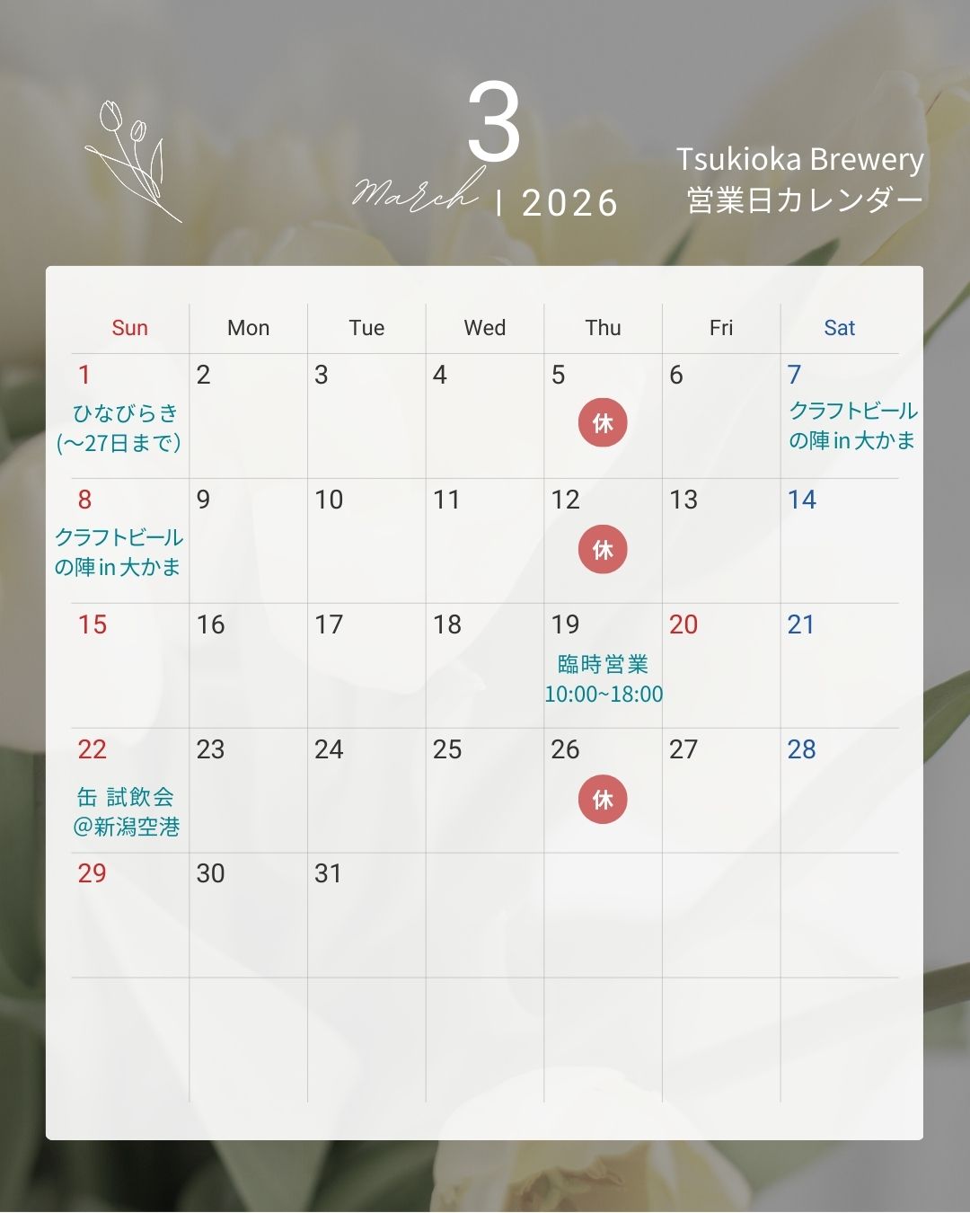 | いつも月岡ブルワリーをご利用いただき、誠にありがとうございます。 3月の営業案内と、期間限定イベントのご案内をお届けします。 ━━━━━━━━━━━━━━ ■ 3月の営業案内 ━━━━━━━━━━━━━━ 月岡ブルワリーは、3月も通常通り営業いたします。 温泉街散策の合間や、ゆったりとしたひとときに、ぜひクラフトビールとお食事をお楽しみください。 ※営業時間・定休日の詳細は、公式サイト・SNSでもご確認いただけます。 ★しばたひなびらき 限定ドリンクにて参加 ★新潟クラフトビールの陣 in 大かま 参戦 ★新潟空港にて缶の無料試飲販売会 開催 |