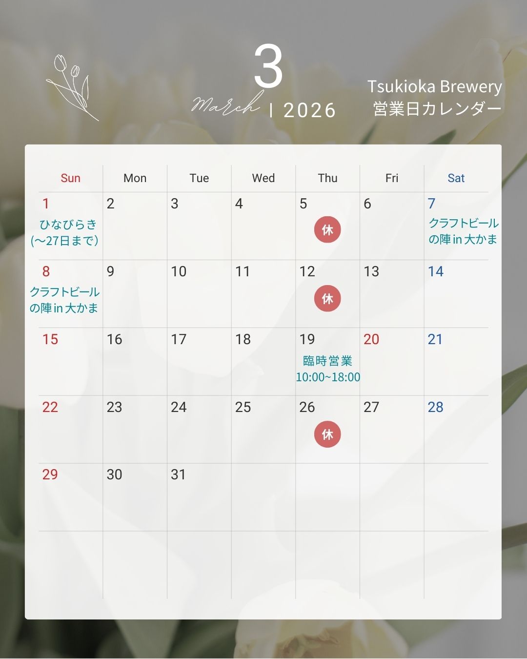 | いつも月岡ブルワリーをご利用いただき、誠にありがとうございます。 3月の営業案内と、期間限定イベントのご案内をお届けします。 ━━━━━━━━━━━━━━ ■ 3月の営業案内 ━━━━━━━━━━━━━━ 月岡ブルワリーは、3月も通常通り営業いたします。 温泉街散策の合間や、ゆったりとしたひとときに、ぜひクラフトビールとお食事をお楽しみください。 ※営業時間・定休日の詳細は、公式サイト・SNSでもご確認いただけます。 ★しばたひなびらき 限定ドリンクにて参加 ★新潟クラフトビールの陣 in 大かま 参戦 |