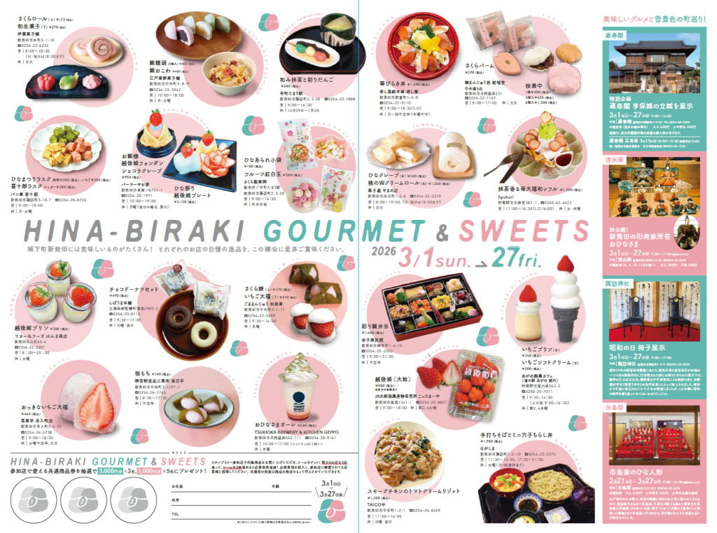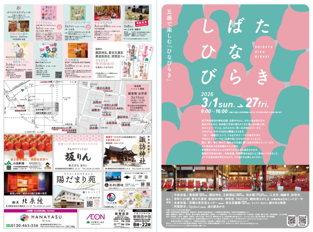 | ━━━━━━━━━━━━━━ ■ しばたひなびらき ━━━━━━━━━━━━━━ 【開催期間】 3月1日(日)~3月27日(金) 【開催場所】 新発田市内各所 城下町であり、神社仏閣、名庭が集まる新発田に雛人形が並びます。 スタンプラリーで期間限定のグルメ・スイーツを堪能! その他イベントも盛り沢山! 「おひなさまオーレ」の2026年バージョンを期間限定でお楽しみいただけます! 雛開きのスタンプラリー対象商品ですので、美味しく召し上がっていただき抽選で素敵な景品も狙っちゃいましょう! |